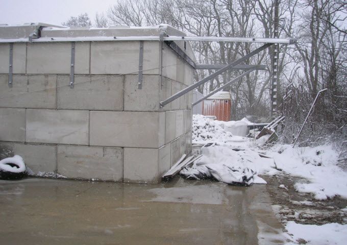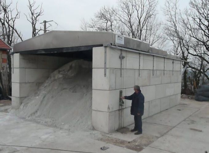 Hauteur murs 3,20m .Dimensions intérieures 5,20 X 8,00m de quoi stocker près de 125 tonnes de fondant routier soit environ 5 camions. Prolongation des rails sur l’arriere pour une ouverture à 100%.