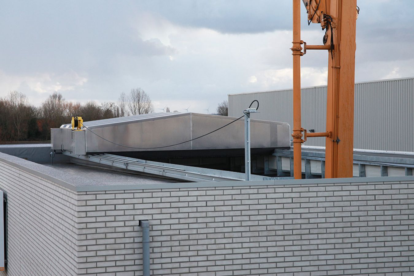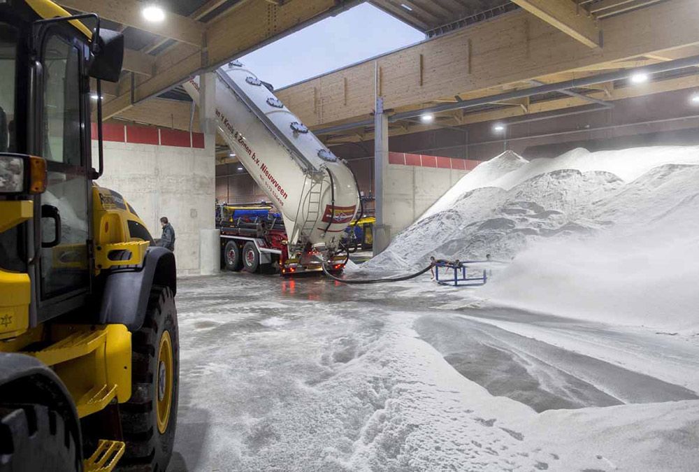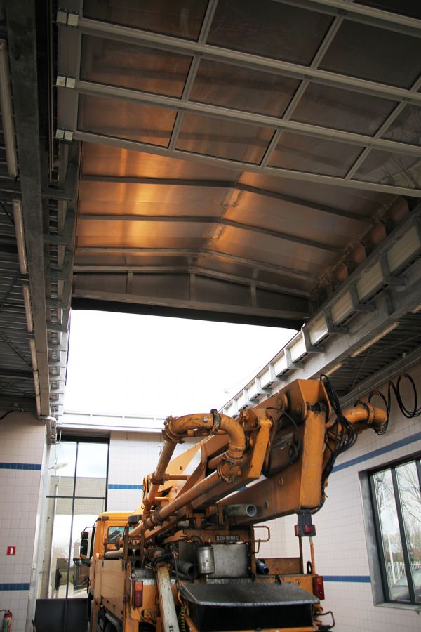 Le Service hivernal Nord, situé sur le Giessenweg à Rotterdam, a une superficie d’un peu plus de 5.000 m² Le hangar a été entièrement rénové et une hauteur maximale était ainsi imposée pour le toit. Cette limite posait évidemment un problème pour les gros camions semi-remorques ou citernes qui viennent déverser le sel d’épandage dans la trémie. Nos toits coulissants mobiles s’ouvrent et se ferment à volonté, entièrement s’il le faut, donc jusqu’à 100%. Le toit coulissant s’ouvre et se ferme plusieurs fois par jour. En conséquence, une commande électrique a été choisie pour cette application.